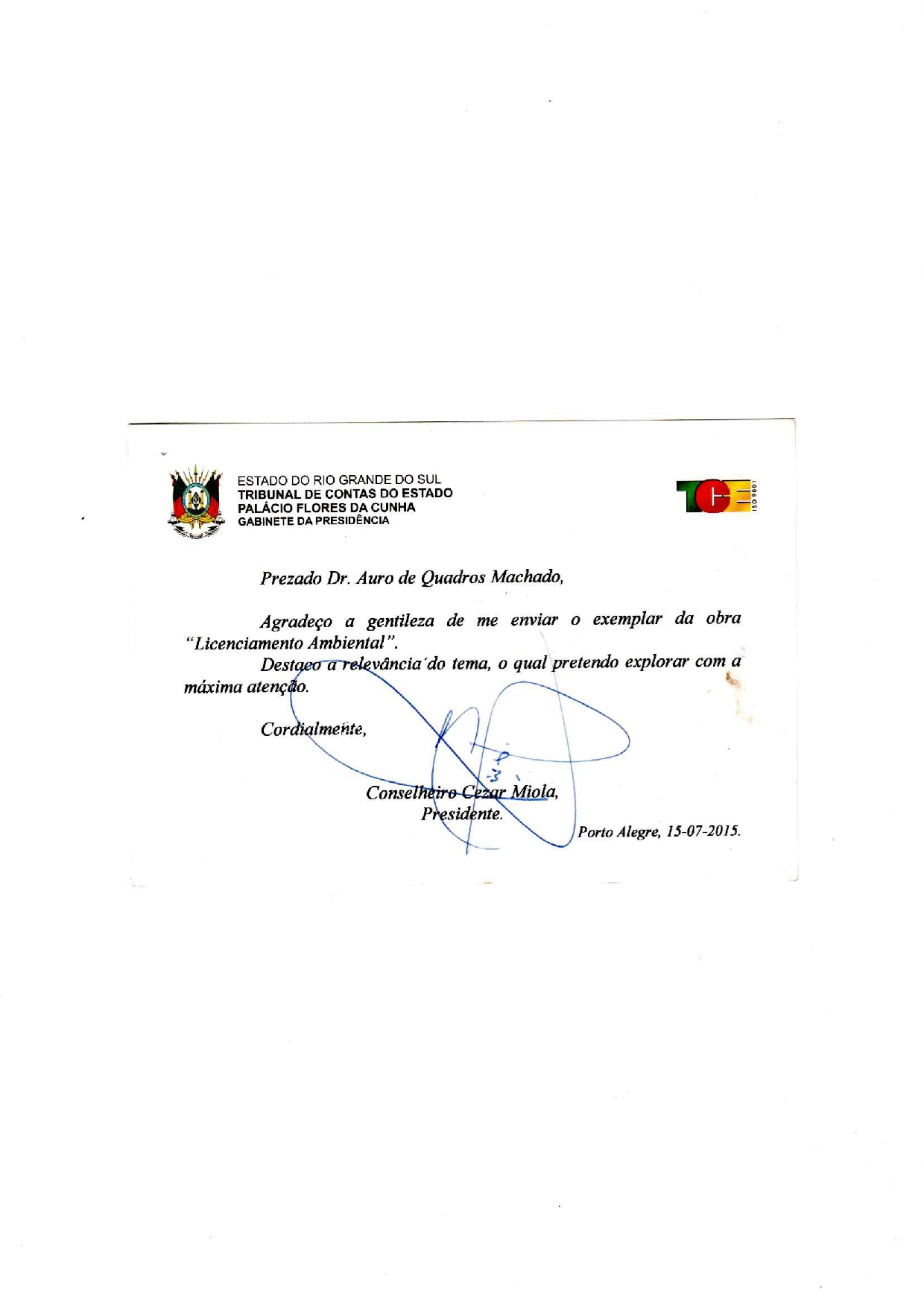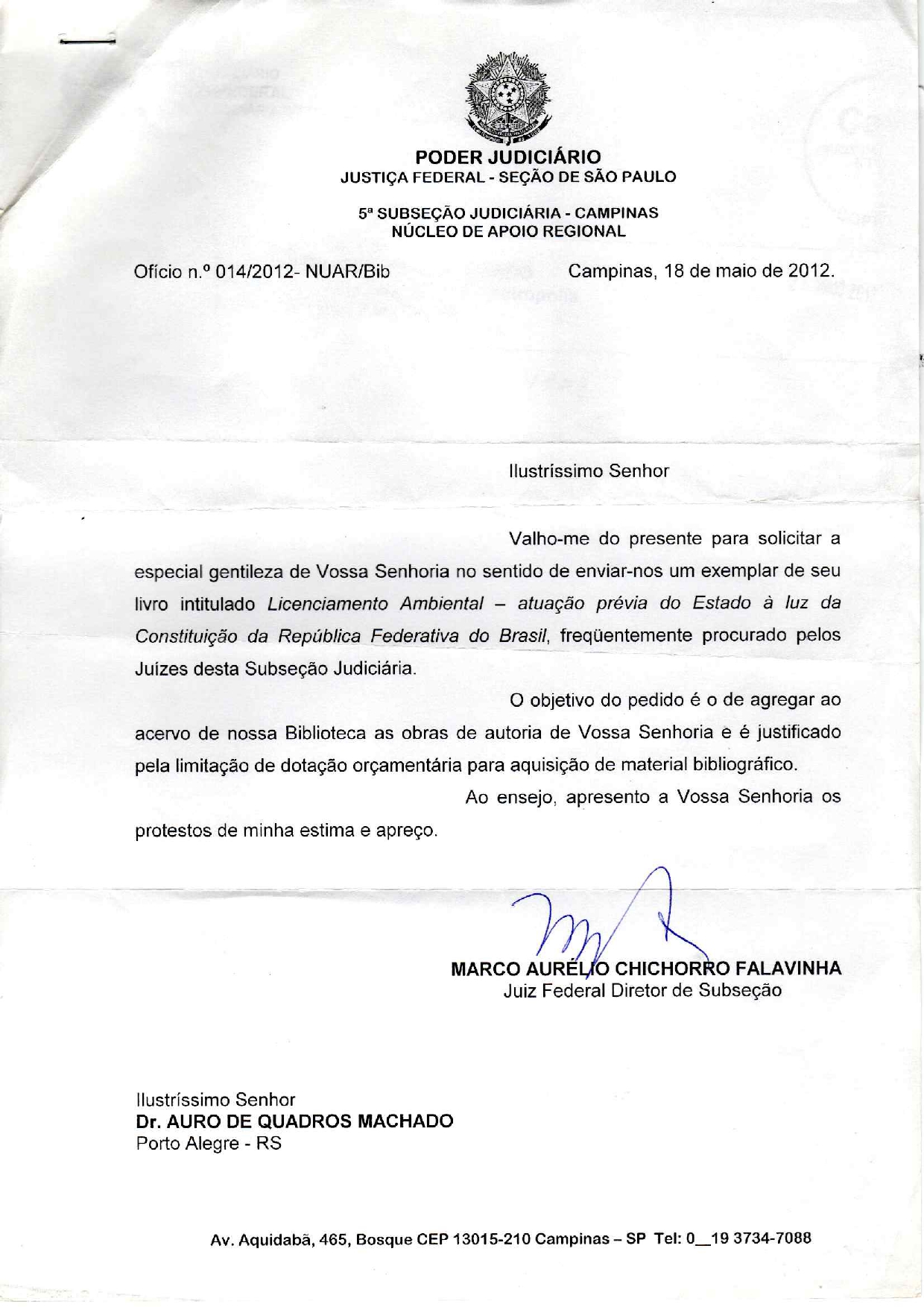 É com grande satisfação que o sócio Dr. Auro Machado enviou, a pedido, a obra autografada para o juiz federal, Dr. Marco Aurélio Chichorro Falavinha,